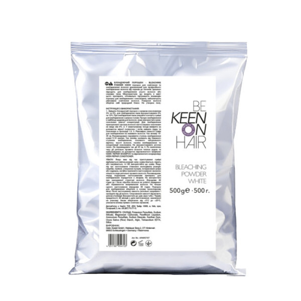 Порошок блондуючий висвітлюючий для волосся від ТМ Keen знебарвлює від коренів до кінчиків волосся. Підходить як для повного зафарбовування волосся, так для створення пасьм та мелірування. Його структура не утворює пилу, легка в нанесенні на волосся. До складу входити натуральний рисовий крохмаль. М'яка формула та легка текстура.