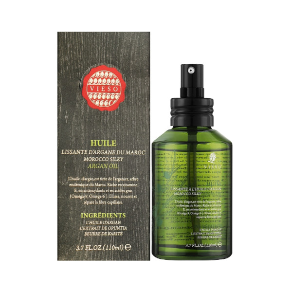 Шовкова арганова олія для глибого відновлення від Vieso - це натуральний засіб для догляду за волоссям та шкірою, який виготовлений з арганових горіхів, вирощених у Марокко. Олія має багатий склад, що надає шкірі та волоссю всі необхідні поживні речовини, живить, зволожує та зміцнює їх. Дивовижна за своїми корисними властивостями олія збагачена екстрактами арганії колючої та опунції індійської. Також у складі ефірна олія лаванди, багата на вітаміни А та Е. Олійка захищає волосся від негативного впливу ультрафіолету, усуває сухість, запобігає розпушуванню, склеює посічені кінчики, надає волоссю здорового сяйва та гладкості.
