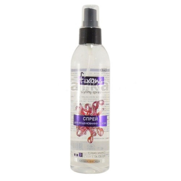Спрей для моделювання зачіски від Fixona, легко допомагає змоделювати зачіску, а також додоє їй об'єднання об'єму, блиску, зволожить, відновить структуру волосся та збереже від термічних руйнувань, спричинених дією плойки та фену. Спрей затримує вологу та захищає волосся, завдяки місту у своєму складі провітаміну В5 та термостійким полімерам.