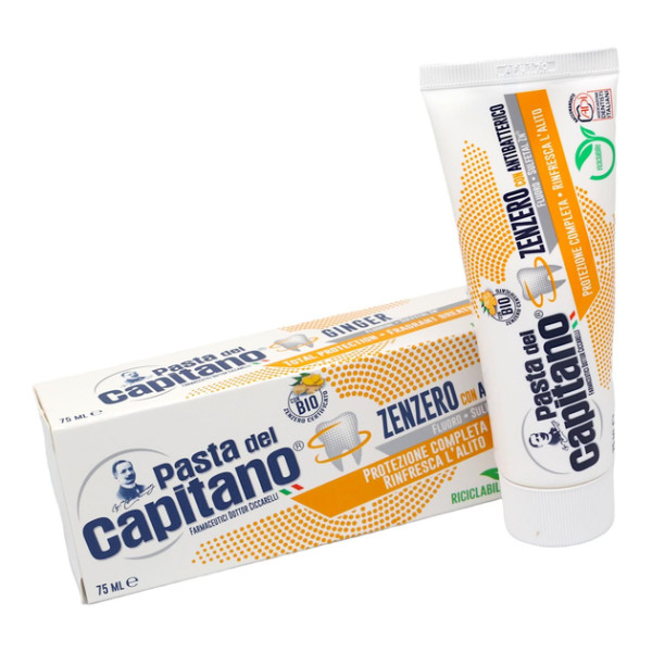 Зубна паста Pasta del Capitano Zenzero (імбир) з антибактеріальним ефектом захищає й освіжає дихання, ідеальна для правильної щоденної гігієни порожнини рота.